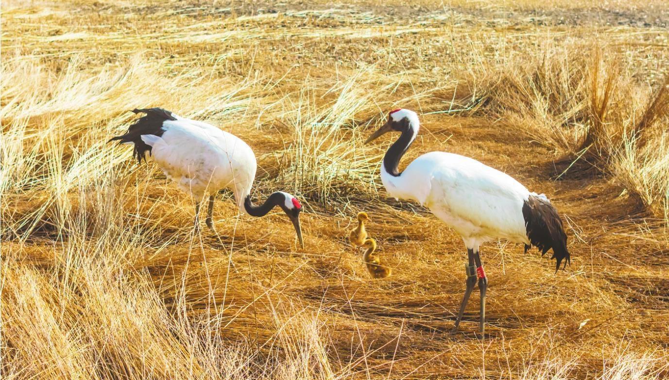 为进一步加强丹顶鹤物种保护,盘锦市系统开展丹顶鹤野化放归工作。截至2026年4月,累计放归野外丹顶鹤280只。当地为放归的丹顶鹤佩戴了微型跟踪器,并联合辽宁大学建成了辽河口人工繁育丹顶鹤基因库。持续监测结果显示,放归个体已逐步适应野外生存,累计在野外发现筑巢41巢,成功出雏43只,标志着野化放归工作取得初步成效。图为4月17日盘锦监测到的今年第一巢丹顶鹤幼崽。
